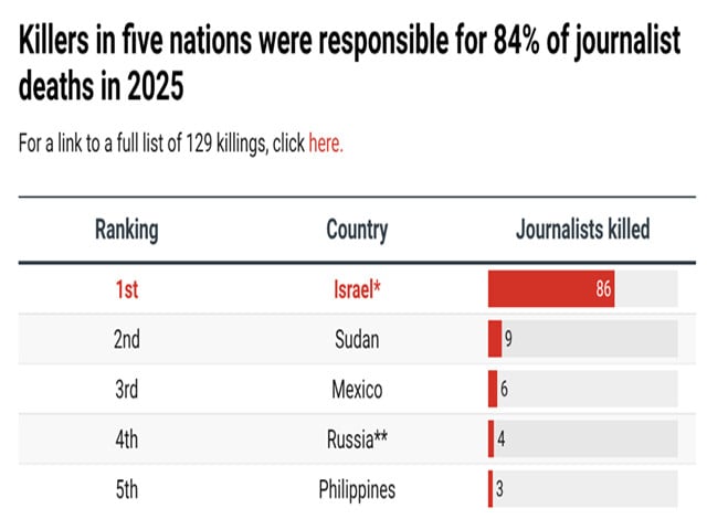 The New York-based media freedom watchdog says more than 60% of the 86 journalists killed by Israeli fire in 2025 were Palestinian reporters covering the war from inside the war-torn enclave, where UN experts and human rights organisations have described the scale and pattern of violence as amounting to genocide.