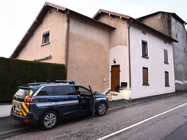 French police gather outside the house where the bodies of two infants have been discovered in a freezer in Ailleviller-et-Lyaumont, eastern France on Feb 12, 2026. PHOTO: AFP