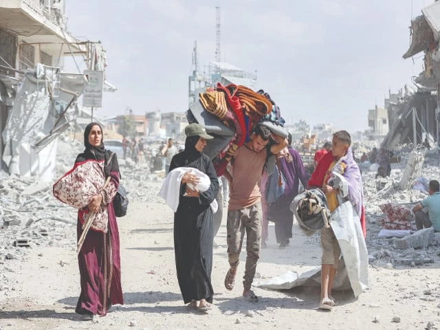A woman carrying a child speaks with another boy as they walk with other people past the rubble of destroyed buildings in the centre of Khan Yunis in the southern Gaza Strip. Photo: AFP