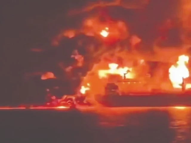 This video grab taken from UGC images posted on social media shows two oil tankers on fire off the coast of Iraq. Photo: AFP